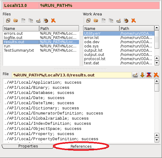 The References view shows two file lists. Files shows the files stored in the test run directory. The work area file list shows the files from last test (input and output files). The work area list will be refreshed when running the next test. When selecting a file entry in one of the lists, the file content is displayed in the file edit area below the lists.