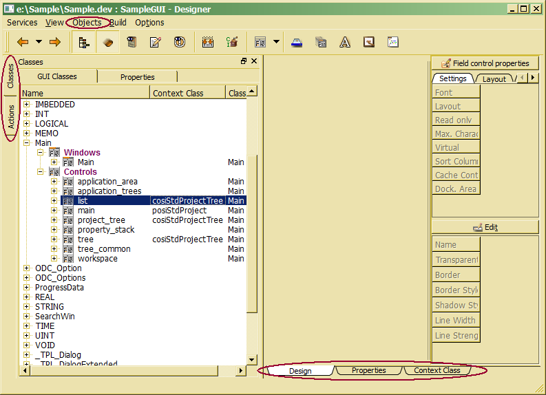 The three tabs below the work area allow switching between different views. The Design view will be activated, when selecting a control in the class tree for design. The Properties view displays properties of the currently selected entry in the class or action tree. When a window, control or field that is associated with a context class has been selected in the class tree, the Context Class view shows the implemented handlers and actions in the associated context class.