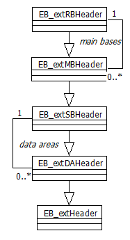 Each header is extended with a corresponding header extension (EBRootBase, EBMainBase, EBSubBase, EBDataArea), which points to the file position for the next external header. Thus, one may dynamically add new main bases or data areas.