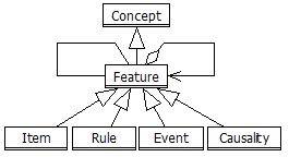 Items summarize a number of more specific features. Rule, event and causality are features defined for items as well as constraints.