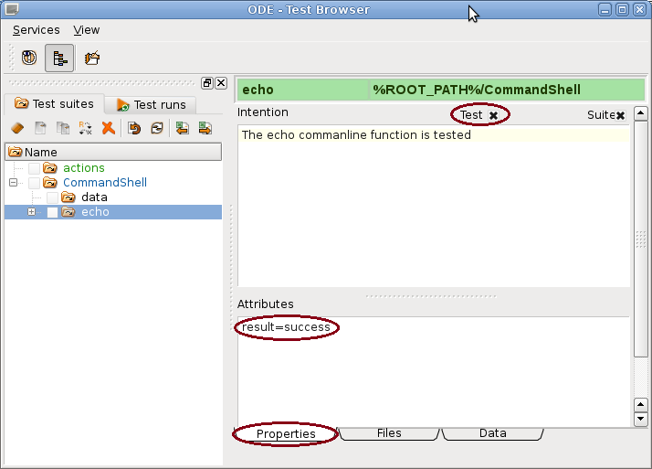 Test and Suite option must be switched on. After creating a new test suite, the Properties tab should be selected for entering a short description for the test case and required test suite attributes. The result attribute should be used to indicate, whether a successful test is expected or not.