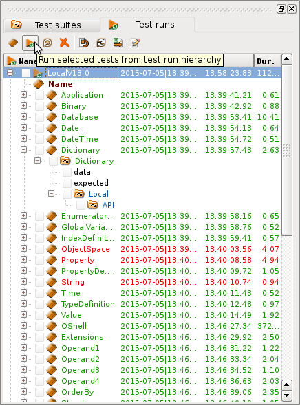 The test run tree is a directory tree that lists test run directories on top (e.g. LocalV13.0) and test directories (e.g. Dictionary) on next lower level. Test directories (RunEntry instances) are arranged in a similar hierarchy as test suites and test cases, but below the test_runs directory. In the list, tests are displayed on same level in order to increase readability.