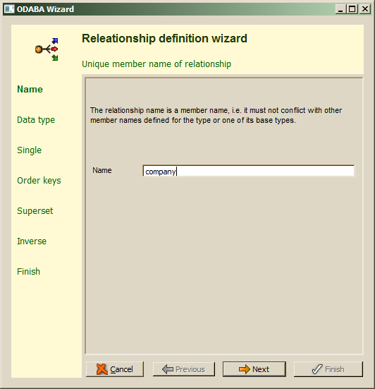 Relationship names have to be unique within the members defined for a data type and its base types. Relationship names are technical names and must not contain special characters or spaces except underscores. After filling in the relationship name, Next should be pressed in order to continue. When the relationship name is not correct or has already been defined as member for the data type or one of its base types, an error will be displayed in the wizard's message area.