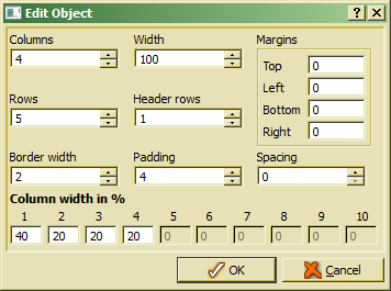 The action creates a new table at current cursor position. When cursor is positioned within a table cell, a table will be created within a table. In order to create a table, a table layout dialog pops up: