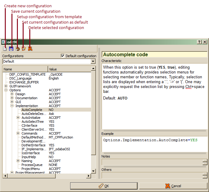 When all developers are going to use the same settings, the default configuration should be updated according to specific requirements. Otherwise, one may create user specificconfiguration by clicking the create new configuration buttonThen, a configuration name, which is typically the user's log-in name, has to be passed and a new configuration with the given name will be created from the default configuration. When starting an ODE application, the configuration name is taken from the environment or configuration file variable USER (Unix) or _USER_NAME (windows). When this variable is not set, ODE tools use the system log-in name (when available). When no configuration with the detected name is available, the configuration marked as default is used.