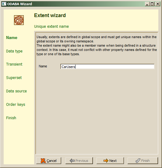 Extent names have to be unique within the resource database (dictionary) or the (next higher) active name space. Extent names are technical names and must not contain special characters or spaces except underscores. After filling in the extent name, Next should be pressed in order to continue. When the extent name is not correct or does already exist, an error will be displayed in the wizard's message area.