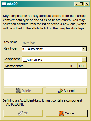 When selecting the Auto-ident Key type, the key component __AUTOIDENT is shown automatically in the Component field and has to be added to the component list by clicking Append. When __AUTOIDENT does not yet exist as attribute, it will be added to the attribute list with data type INT(10).