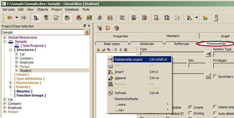 In order to provide a new relationship, the relationship wizard might be called from the relationship list, which can be activated by clicking the Relationships tab on the Members tab for the selected data type.