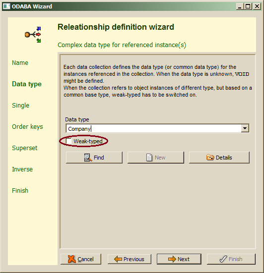 Relationships always refer ton complex data type instances. For selecting a complex (user-defined) data type, one may enter the type name directly in the Data type field or use enhanced find by pressing the Find button, which allows selecting a data type defined in the project or a system data type. When the data type entered does not yet exist, one may enter the new data type name in the field and press the New button. In this case, a sub wizard for defining new data type pops up (Data Type Wizard), which is described in chapter "Data Type Wizard". For viewing the type definition for the selected type, the Details button may be used.