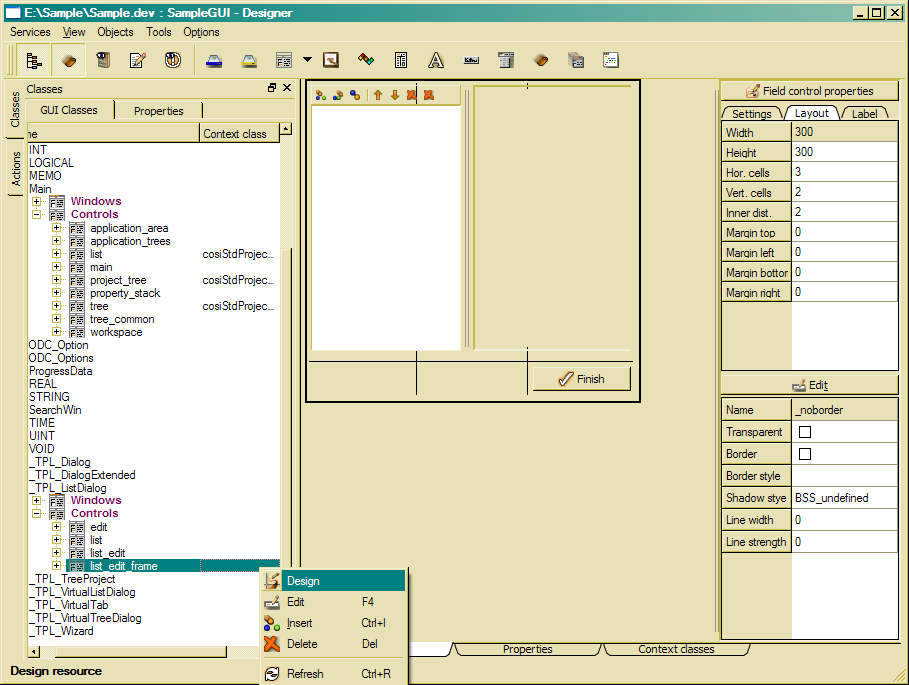 In order to change new or existing design patterns, the pattern class has to be selected in the class tree. Expanding the Controls or Windows region controls can be changed by design by selecting Design from the class tree context menu.