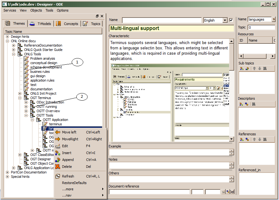 In order to create a new topic in the topic tree (Themes), chose Insert or Append from the tree's context menu. An insert dialog pops up that requests the name for the topic in the hierarchy.