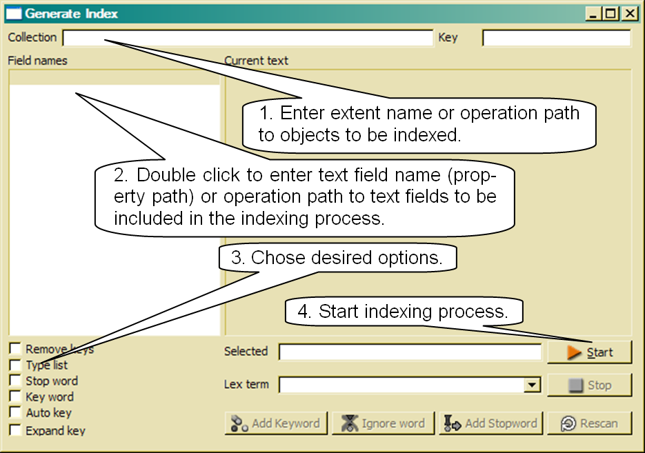 Index services are provided in order to create a full text search index for topics. In order to update the current index, Update index might be called from the Tool menu in the Main menu bar, or IndexServices. might be called from a command line.