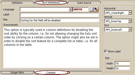The Label defined for the content description is only used for initializing usage hints. The Titlefrom the content definition is shown as tool tip, when no tool tips have been defined in user hints definitions (User Hints). The characteristic will be displayed as content help. When the field is empty, hints from Text definitions are shown when requesting content help.