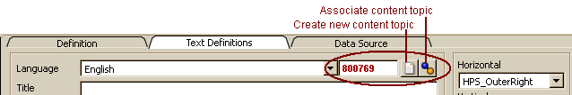 Text definitions for fields are initialized, when fields have been dragged into the form or when adding a field to a form with the name of a property of the current class. When being initialized from property data source definition, the content definition shares the documentation topic with the property documentation. One may duplicate, remove or re-associate a topic definition by changing the topic number right of the language field (see Topic number below).